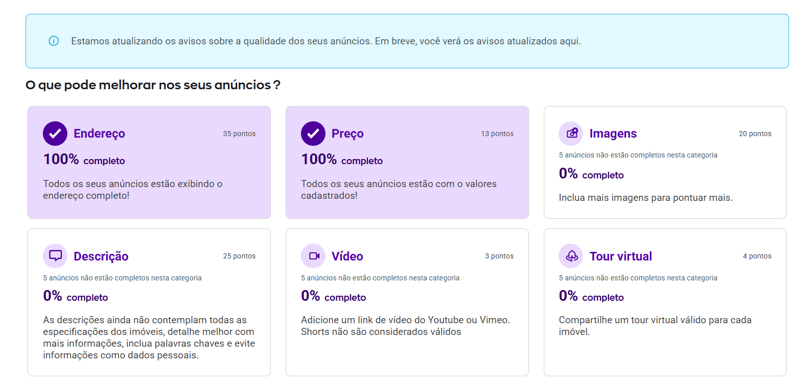 Você pode aumentar a sua pontuação preenchendo o máximo de campos disponíveis no seu anúncio. Priorize os campos que dão mais pontos para aumentar a sua média de qualidade.