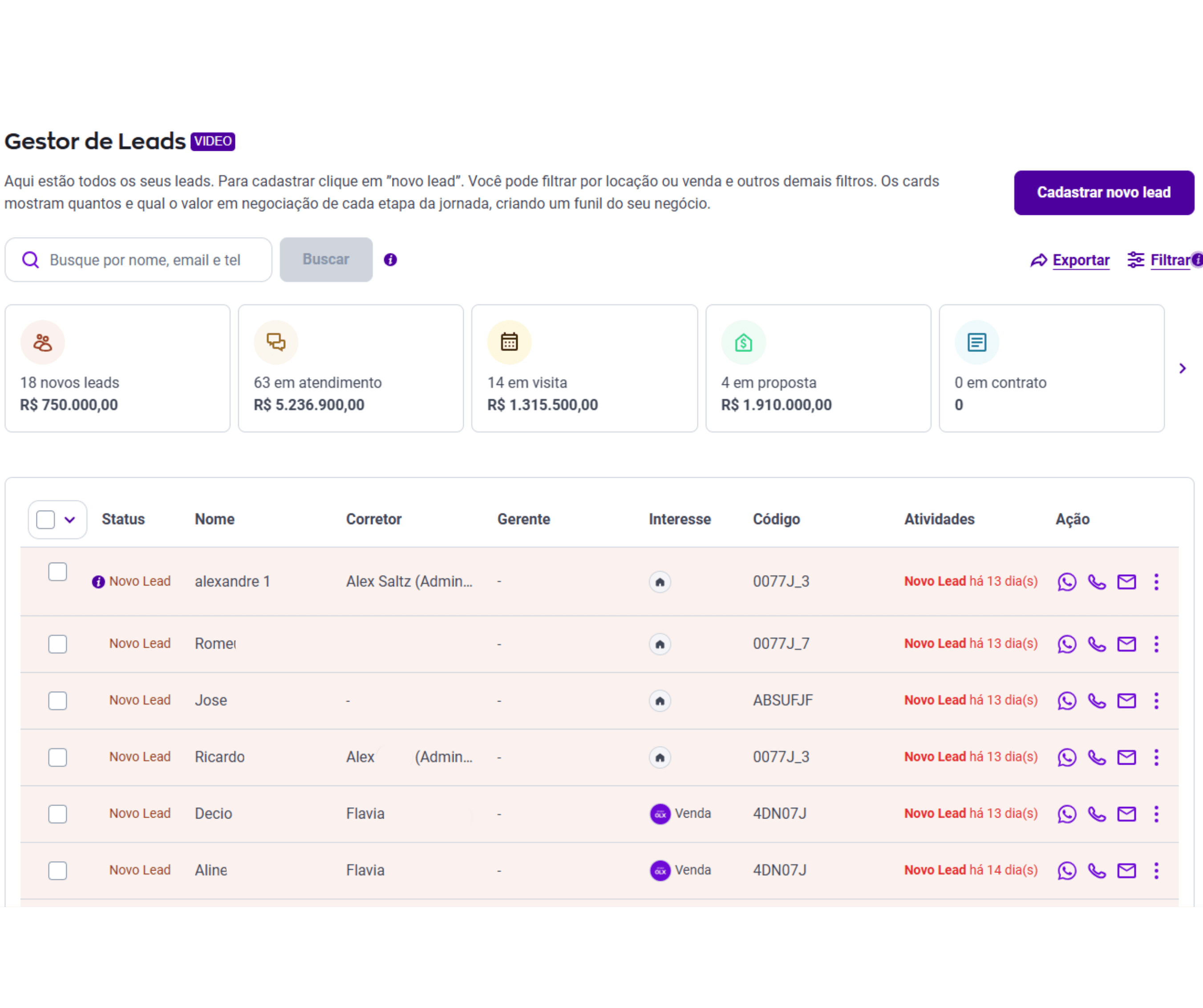 O Gestor de leads é uma ferramenta para otimizar o atendimento da imobiliária, auxiliando na distribuição de leads, acompanhamento de status, contato com clientes e agendamento de atividades.